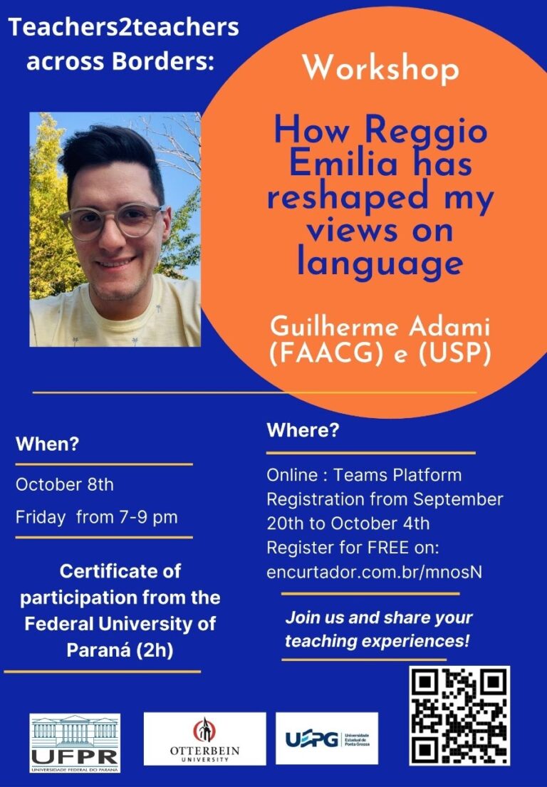 Neste workshop, apresentado pelo professor e mestre Guilherme Adami (FAACG/USP), você terá a oportunidade de entrar em contato e trocar insights sobre o processo de mudança profissional, experienciado pelo palestrante, em relação a sua abordagem de ensino de línguas. Essa mudança foi resultado do contato com as ideias filosóficas, políticas e pedagógicas de Reggio Emilia.