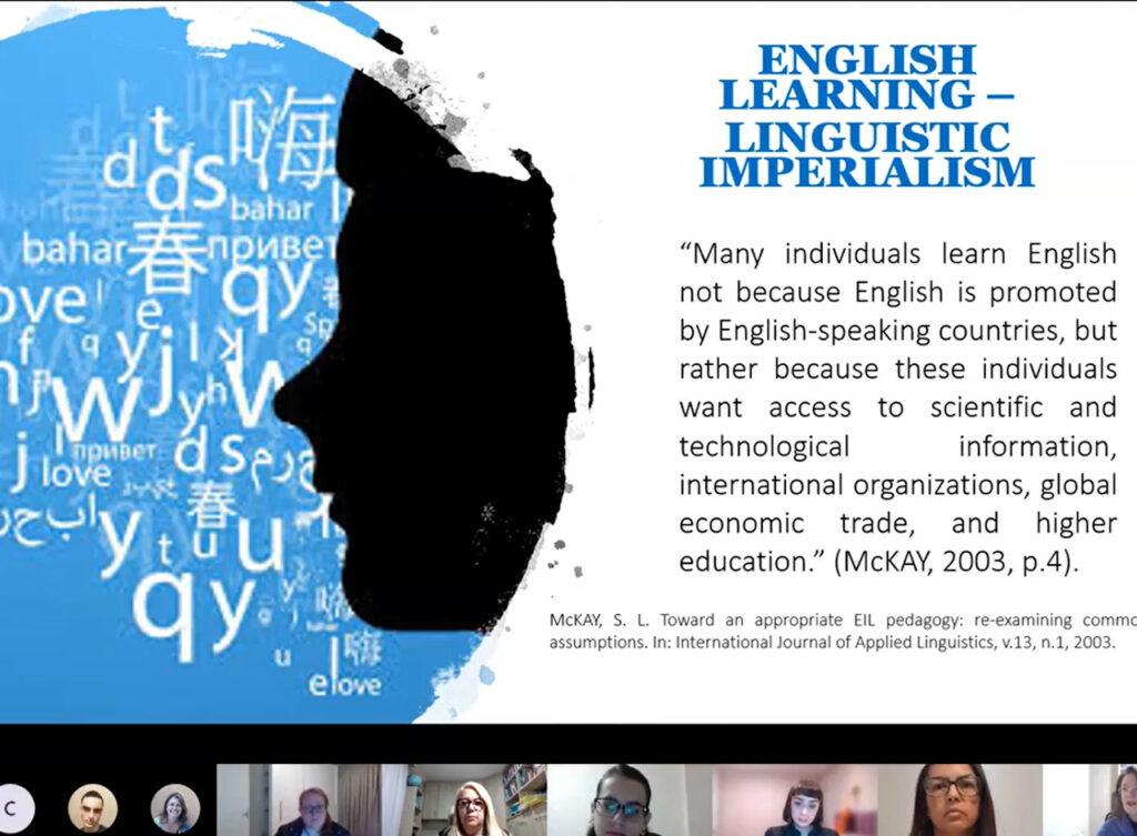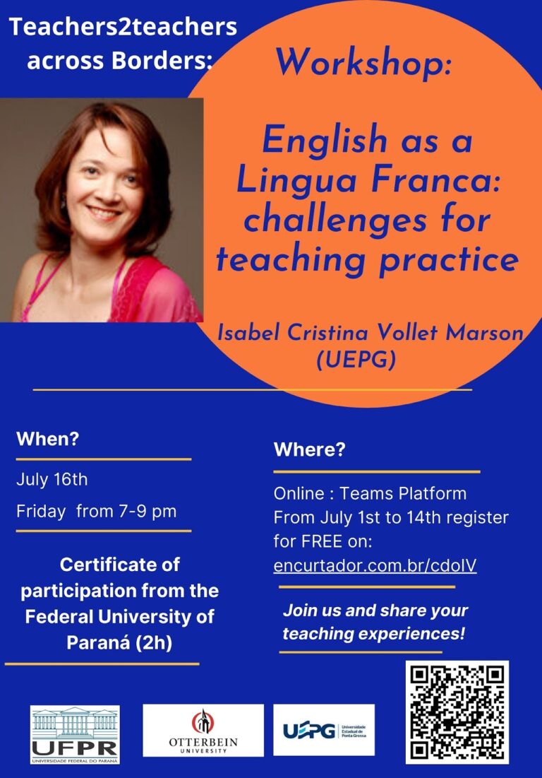 O evento English as a Lingua Franca: challenges for teaching practice , ministrado pela Prof.ª Dr.ª Isabel Marson, da UEPG, foi realizado em duas edições (19 de julho e 6 de agosto) devido ao grande número de interessados. Foram dois momentos formação docente em contexto online, viabilizados pelas novas tecnologias de informação e comunicação  que promoveram a interlocução e socialização intercultural entre licenciandos e professores de língua inglesa brasileiros, professores estadunidenses e professores de outros países latino-americanos em atuação Educação Básica da rede pública de ensino, para discutir a expansão da língua inglesa em contexto global e as implicações do seu uso em contextos de interação.