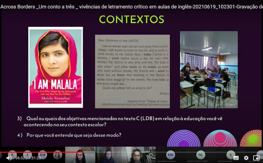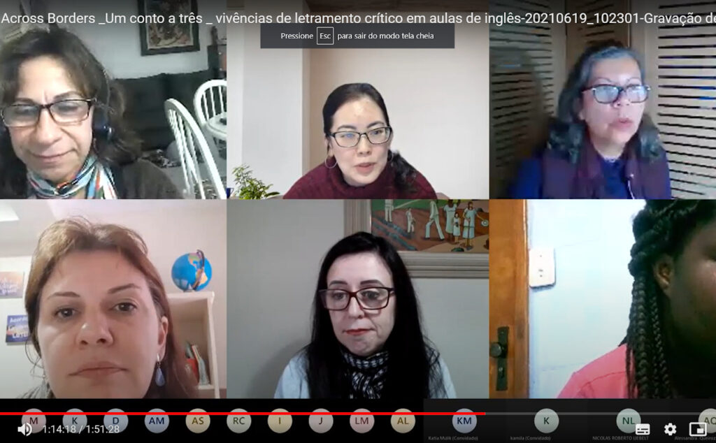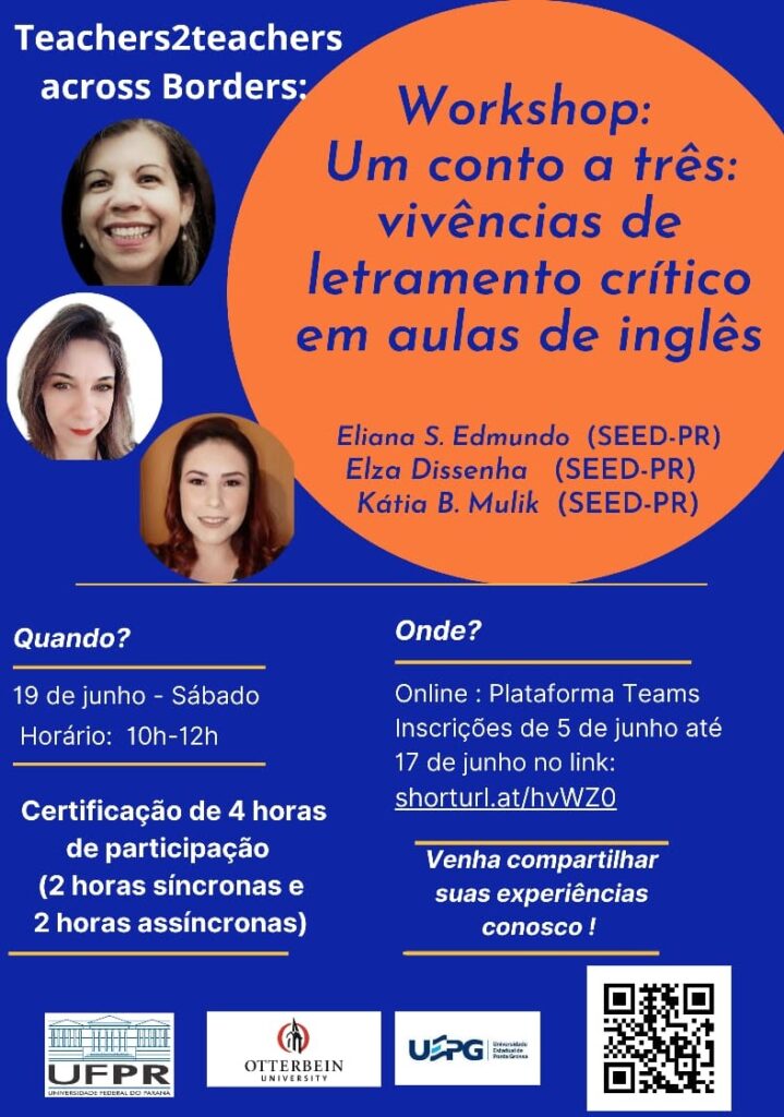 No evento intitulado Um conto a três: vivências de letramento crítico em aulas de inglês, as professoras de Educação Básica: Eliana Edmundo , Elza Disssenha, Kátia B. Mulik compartilharam, em uma oficina interativa ministrada em português, um projeto de letramento crítico que desenvolveram durante o curso  de extensão de 2019. Durante o workshop os participantes foram provocados a pensar e a discutir sobre os conceitos de educação, de ensino-aprendizagem e de criticidade na escola brasileira.