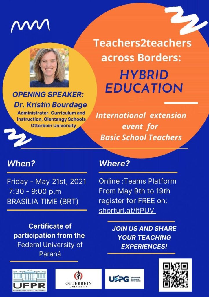 O evento Teachers2teachers: hybrid education , ministrado pela Prof.ª Dr.ª Kristin Bourdage, da Universidade de Otterbein e pelas Prof.ª Dr.ªs Angela Walesko e Denise Hibarno, da UFPR, foi realizado no dia 21 de maio de 2021 e configurou-se como um espaço internacional virtual de formação docente por meio do diálogo intercultural entre professores da Educação Básica pública brasileira e de outros países. Além disso, também buscou oportunizar a discussão crítica reflexiva acerca de experiências educacionais relacionadas à educação híbrida, especialmente as vivenciadas durante a pandemia Covid-19 em seus contextos culturais locais.