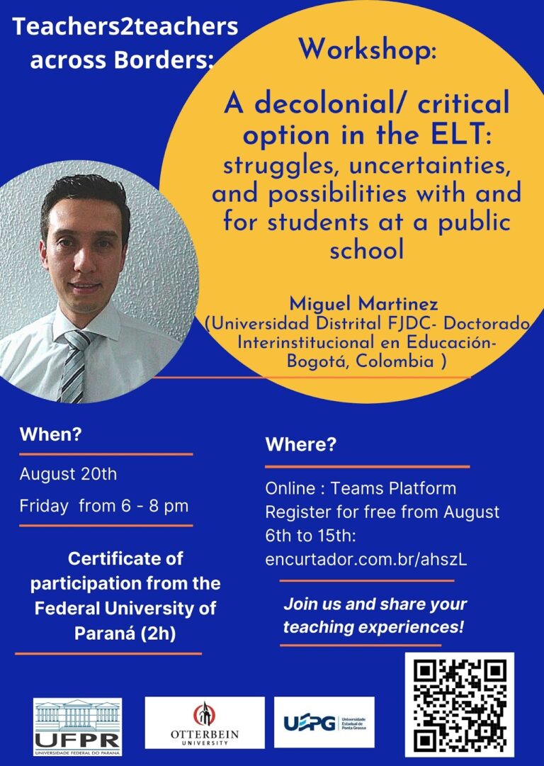 O evento A decolonial/ critical option in the ELT: struggles, uncertainties, and possibilities with and for students at a public school foi  ministrado no dia 6 de agosto de 2021 pelo Prof. Me. Miguel Martinez, da Universidade Distrital FJDC, em Bogotá, na Colômbia.  Seu objetivo foi  refletir sobre as experiências das escolas públicas da Colômbia a partir de uma perspectiva decolonial e crítica. Dessa forma,  o palestrante analisou diferentes métodos para o ensino de inglês nesses tempos difíceis, como o casos relacionados à transformação social, desigualdade, diversidade e relações de poder. Durante o workshop, Martinez aprofundou pontos teóricos que contribuíram para o debate, como aqueles discutidos por  Escobar, Mignolo, Quijano, Maldonado Torres, Castro Gomez, Walsh, Grossfoguel, entre outros.